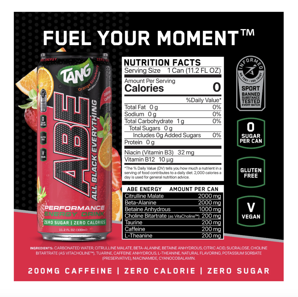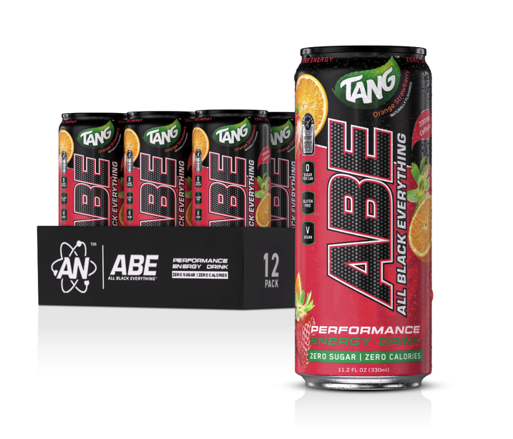 استمتع بمزيج طاقة منعش مع ABE Energy Drink – Tang Orange Strawberry.