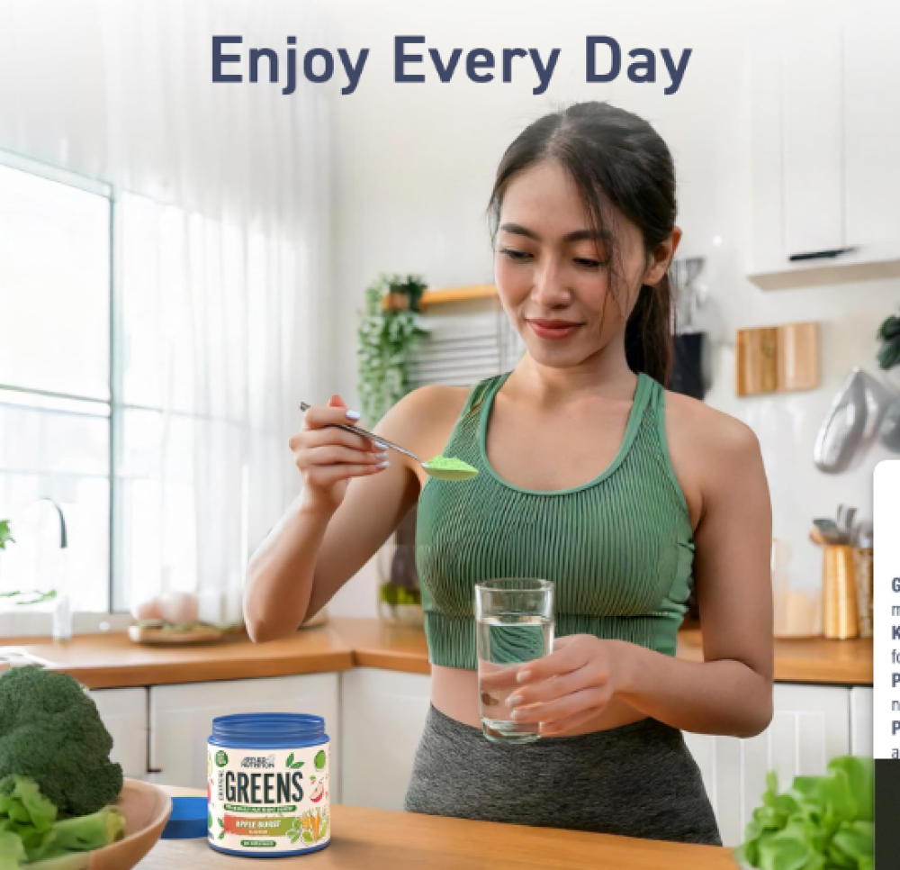 امنح جسمك دفعة مغذّية قوية كل يوم مع تركيبة متكاملة من 17 نوع من الخضروات الخارقة، الفيتامينات والمعادن – في ملعقة وحدة بطعم تفاح ينعشك!