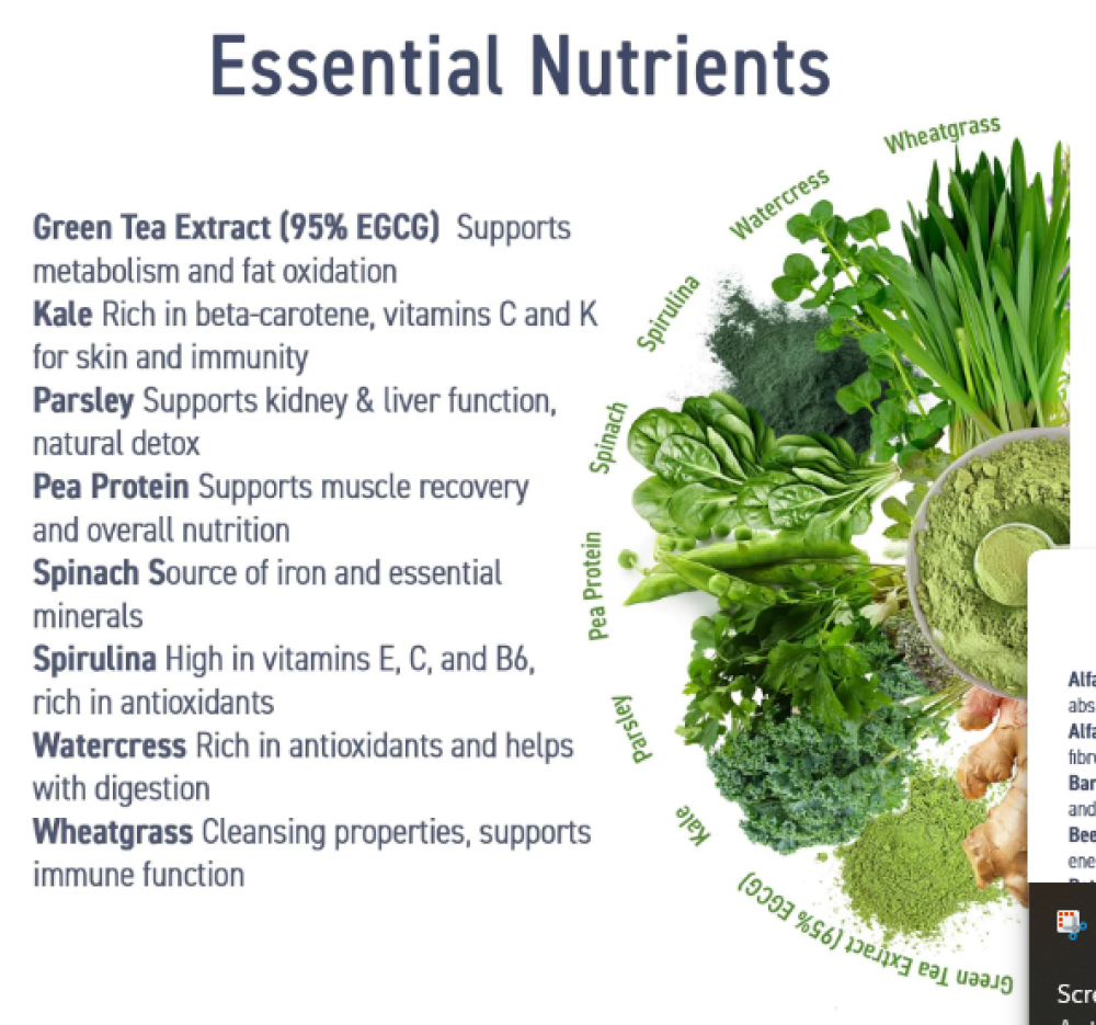 ✅ يدعم المناعة والهضم: يحتوي على السبيرولينا، عشبة القمح، والبروكلي لتقوية جهازك المناعي وتحسين صحة الأمعاء.