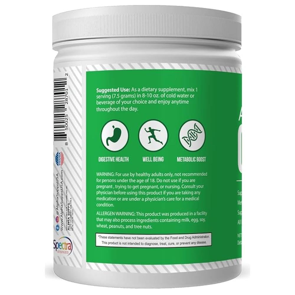 🌱 مزيج فواكه وخضروات: يحتوي ألفا جرينز على خلاصة أناناس، سبيرولينا، شعير الشعير، وخضروات أخرى غنية بالمواد المغذية التي تعزز من الهضم الصحي وتعزز وظائف الجهاز الهضمي.