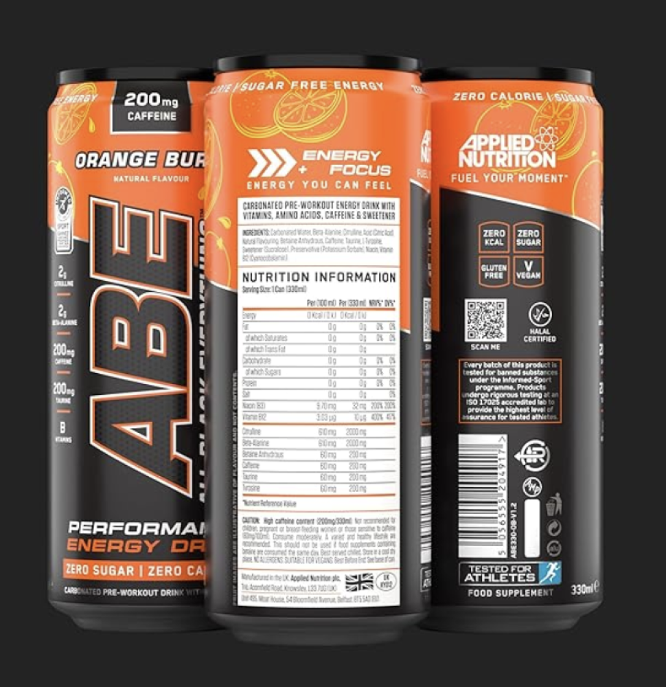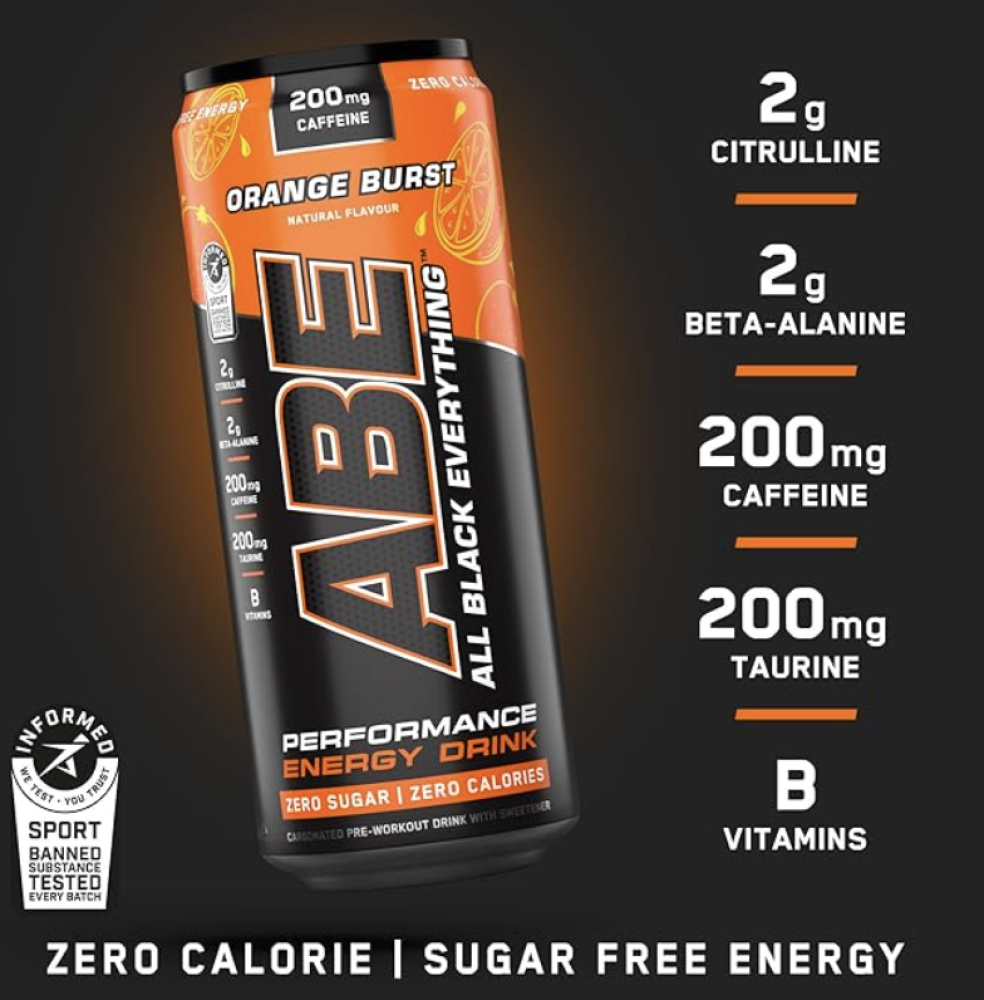 استمتع بطاقة منعشة مع مشروب الطاقة ABE Energy Drink – Orange Burst من Applied Nutrition، المصمم ليمنحك التركيز، القوة والتحمل قبل التمرين أو أثناء يومك المليء بالأنشطة. يحتوي على 200mg كافيين، 2g بيتا ألانين، 2g سيترولين، وفيتامينات B لدعم الأداء الجسدي والعقلي.